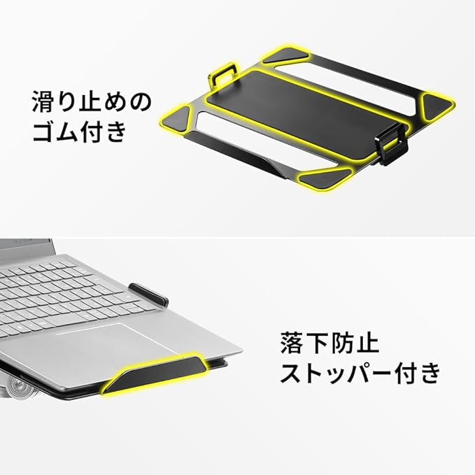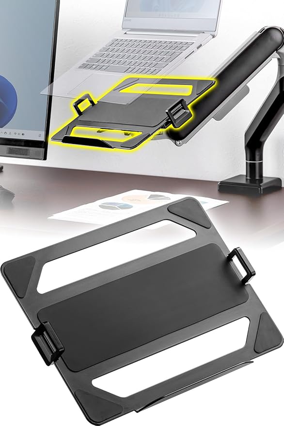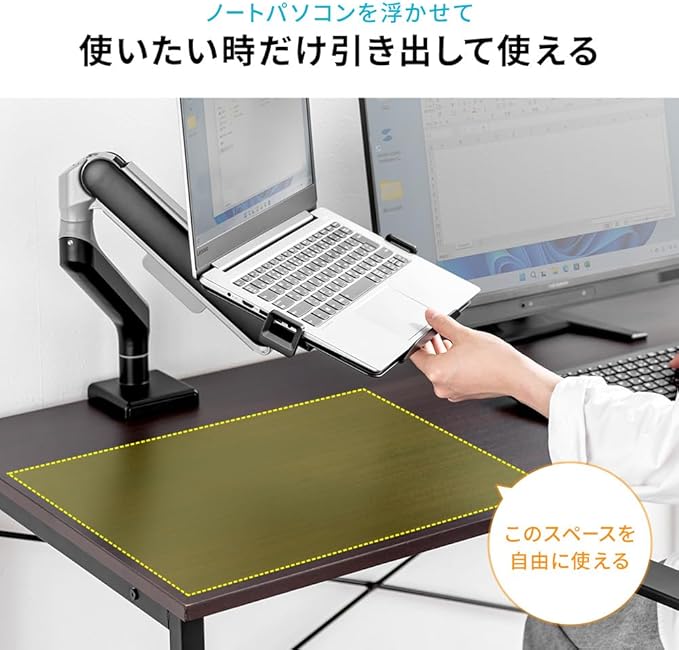 【サブディスプレイを見やすい位置で】モニターアームに取り付けて、ノートパソコンを浮かせて使えるホルダーです。見やすい位置に調整し、メインモニターの高さや目線の高さに合わせたサブモニターとしてご使用いただけます。(※モニターアームは別売りです)