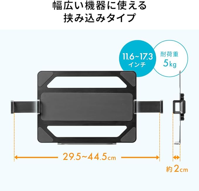 【伸縮するホルダーでしっかりホールド】自由な位置に浮かせて使えるので、デスク上のスペースを有効活用できます。横幅29.5~44.5cmのホルダーアームで挟み込んで使えるので、モバイルモニターやタブレットなどのさまざまな機器に対応しています。