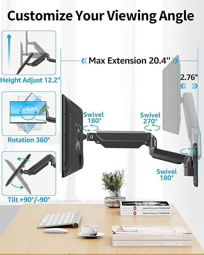 【多角度調整】チルト(上下傾き):上90 /下45 。パン(左右首振り):左90 /右90 。ピボット機能:回転360 。高品質ガススプリング内蔵、より柔軟にモニターの角度を変更できます。回転機能も搭載されたし、画面の横縦の切り替えが手軽に行ないます。