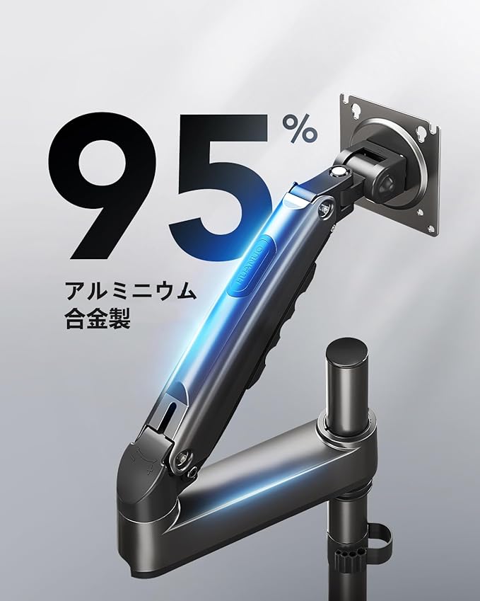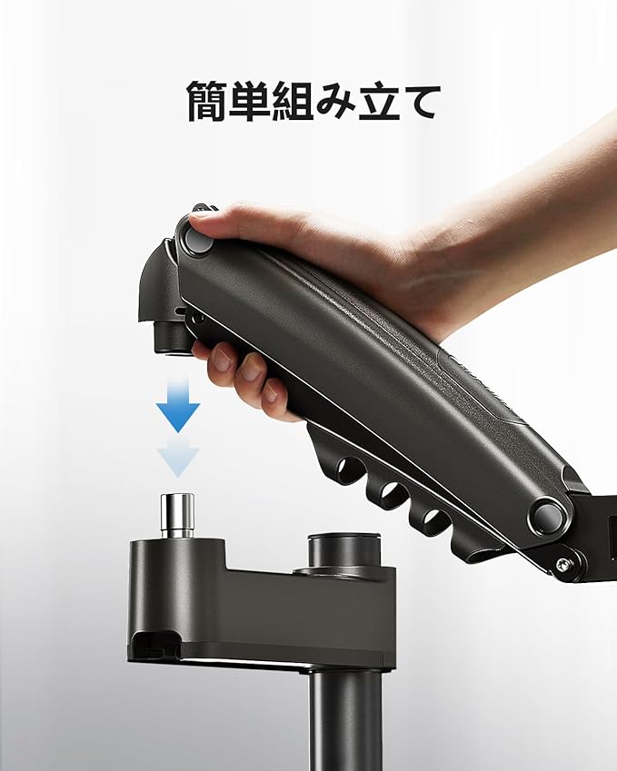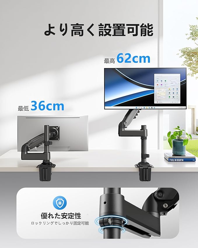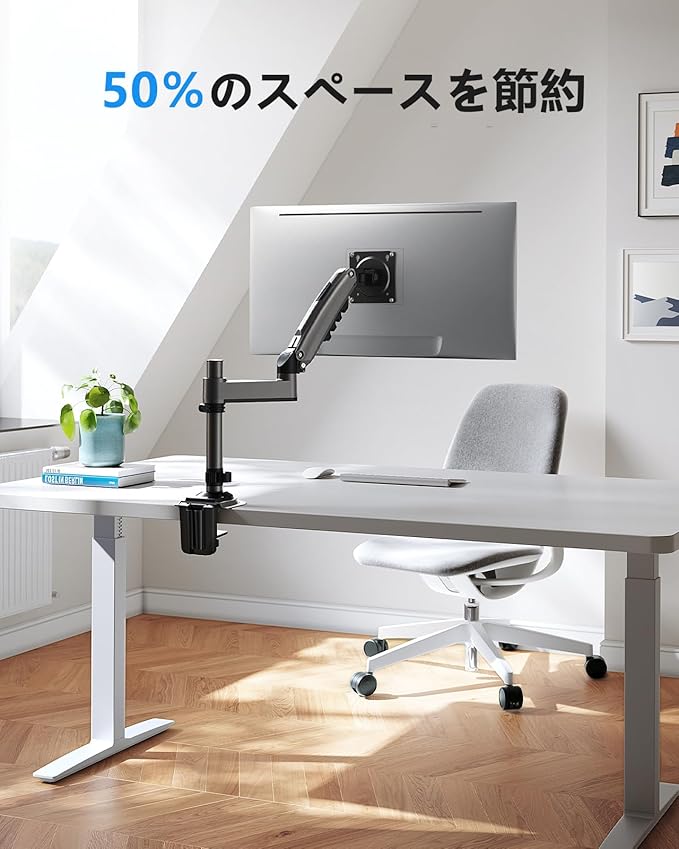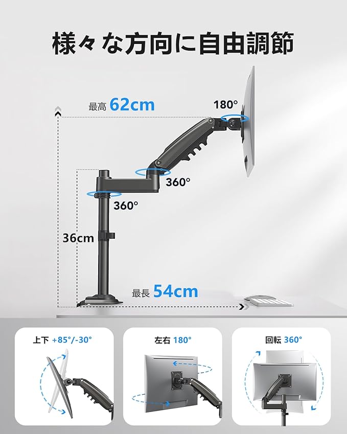 【猫背対策】ガススプリング式でスムーズな高さを調節できます。モニターアームはいろんな角度を調整できて自由度は高いです。そして、立てで仕事もできます。角度や距離などが自分に合わせるにして、背や首の疲れをリラックスします。*説明書に従ってアームを調節してください。