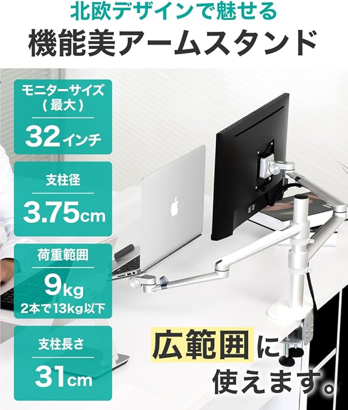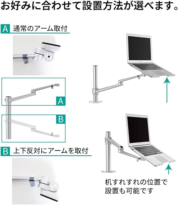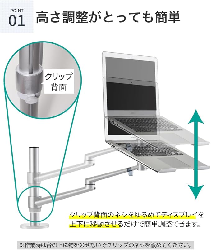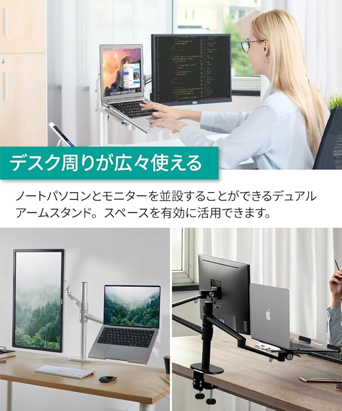デュアルアーム: VESAマウントおよびノートPCホルダーはクイックリリース機能付きで取り付け・取り外しがとても簡単に行えます。 ノートパソコンとモニターを左右入れ替える場合でも工具なしで取り換えも簡単に行うことができます。