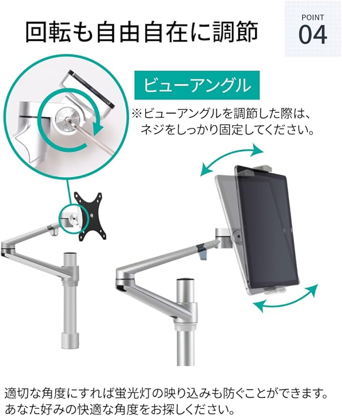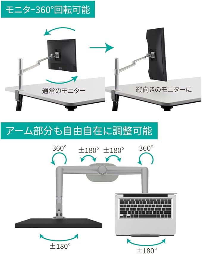 ダブルクランプ: 最大荷重は9kg、天板厚さが7cmまでの机に設置が可能です。クランプを回して支柱を固定するだけ、ダブルクランプだからデスクにしっかり固定ができ、予期せぬ地震やアクシデントからディスプレイの転倒を防ぎます。