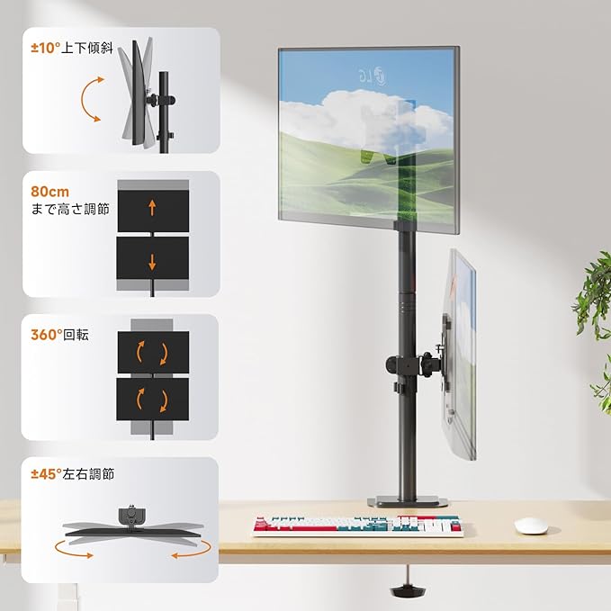 【ディスプレイ角度を自由に変えれる】①アーム:ポールの接続部分移動で高さ調節(810mm) ②VESAプレート部:上向き10 、下向き10 、回転360 、左右各45 。角度や距離などが自分に合って、前後左右に加えて上下も好みの位置に軽々と動かすことができます。ビジネスでの利用はもちろん、トレーダーやゲーマーの方にもおすすめです。 ご注意:付属の六角レンチでボルトを締めて傾斜角度を固定します。一方のモニターが低い場合は、ナットを取り外し、付属の六角レンチでボルトを反時計回りに回してモニターを上げます。調整後、ナットを取り付けます。