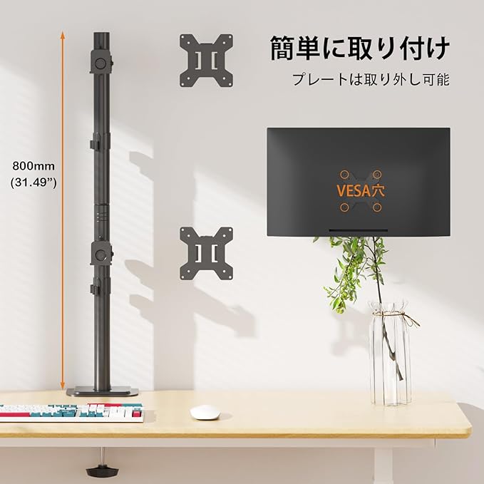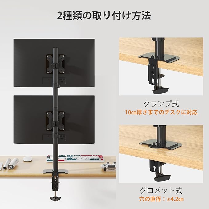 【組立・取付簡単】2取り付け方法:①デスククランプ:頑丈な「C」クランプ(10cm厚さのデスクに適合)は、画面をしっかりと安全に固定し、最高の安定性を提供します。 ②グロメットベースの取り付け:ボルト貫通穴のあるデスクに適合します(穴の最小径は4.2cmです)。 グロメットベースは1.5cmから10cmまでのデスクの厚さをサポートします。商品の組立てはビデオを参照できます。