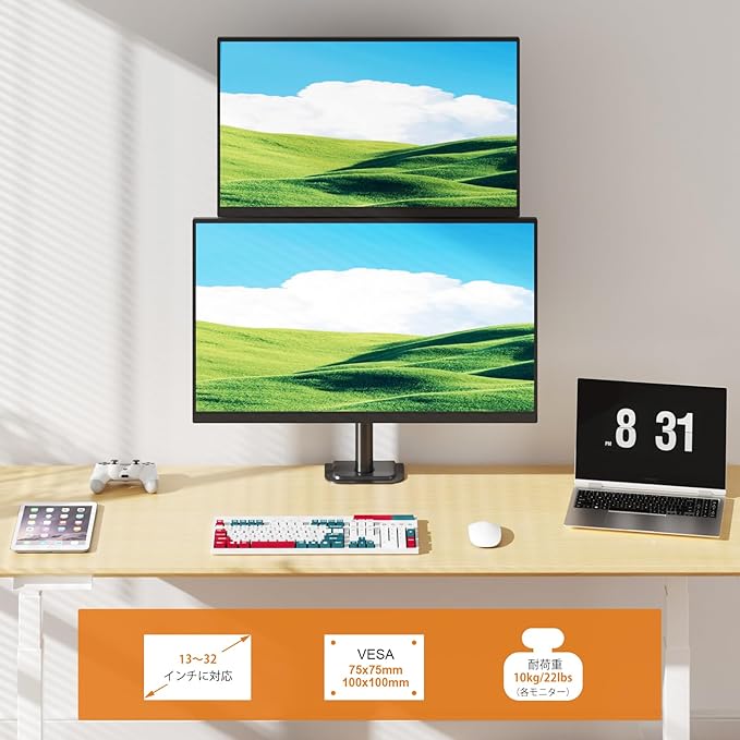 【対応モニター】液晶モニターを2画面設置できるデュアルディスプレイアームです。耐荷重は10KG(1台)で、VESA規格は75 75mm/100 100mmで、13~32インチPCモニターに対応します。