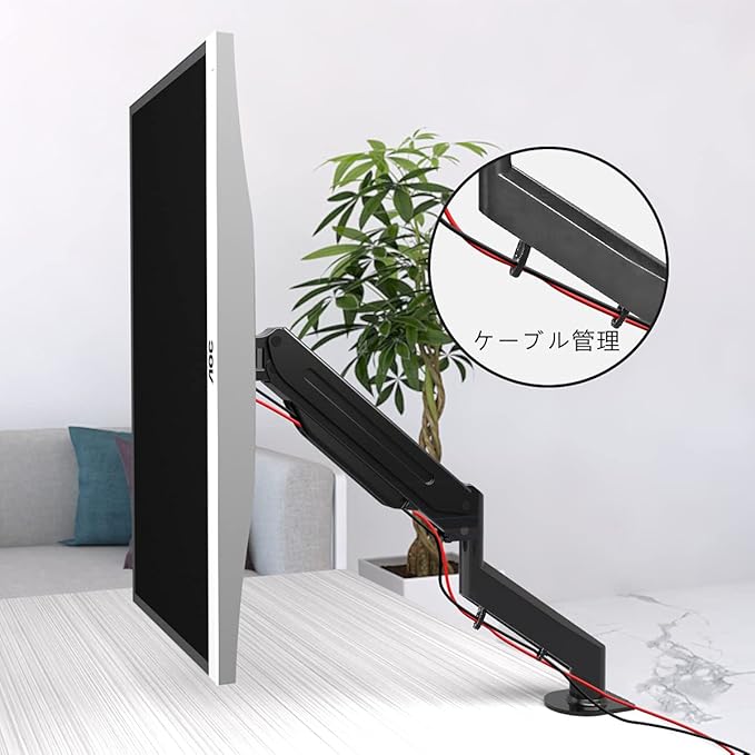 【省スペース】モニターの台座を必要としないので、モニタ下のスペースに書類やキーボードなどを収納でき、デスクの上を広く使うことができます。アーム内部にケーブルを収納できるケーブルホルダーが付いているのでケーブルをキレイに配線できます。ケーブルが遊ばず邪魔になりません。