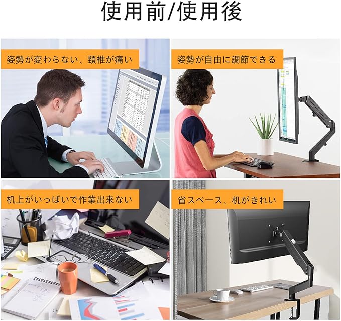 【猫背対策】ガススプリング式でスムーズな高さを調節できます。モニターアームはいろんな角度を調整できて自由度は高いです。そして、立てで仕事もできます。角度や距離などが自分に合わせるにして、背や首の疲れをリラックスします。