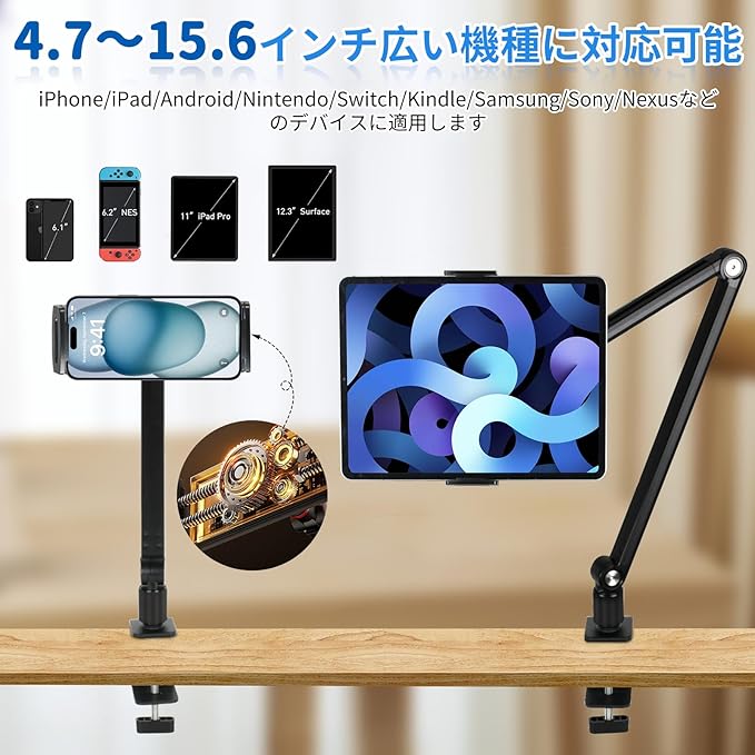 【2024新登場/安定感が強くて落ちにくい】タブレットスタンド スマホスタンド iPadスタンド pcスタンド タブレットスタンド 寝ながら 卓上 スタンド アーム ベッド用 4.7~15.6インチ 360回転 横/縱/仰向け 揺れない 床置き 卓上 折り畳み固定アーム for iPad Pro Mini Air iPhone Switch Kindle多機種対応 日本語取扱説明書