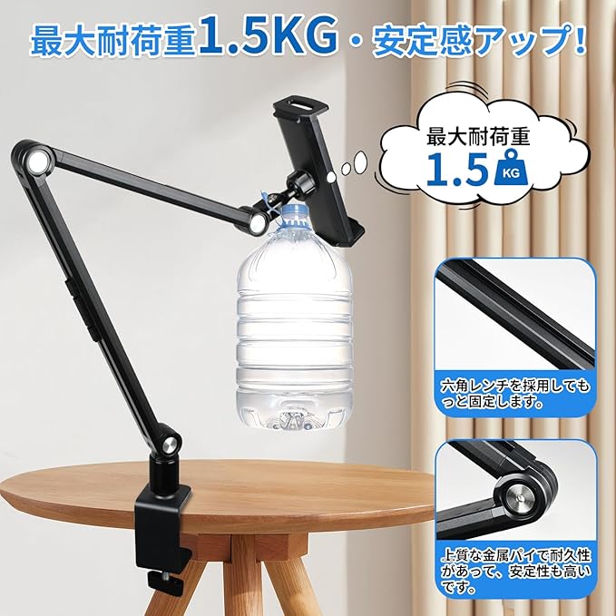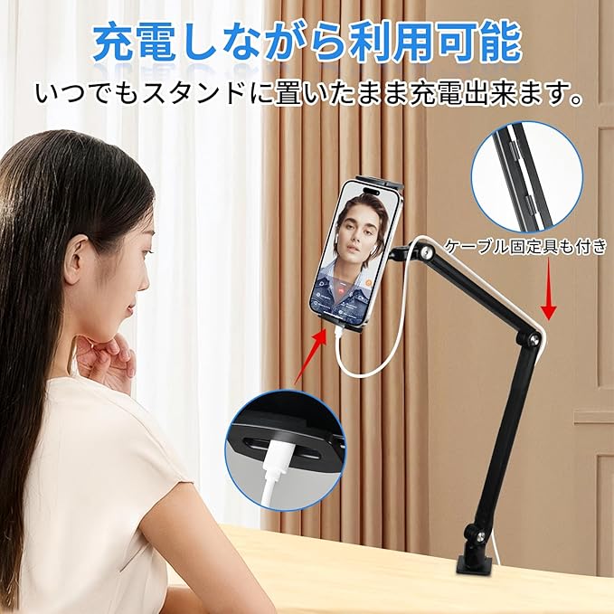 【進化版アーム&充電穴付き】今までのアームは「揺れやすい」「ガタガタ音がする」「強度が弱い」などの欠点がありましたが、進化版アームはこれらの欠点を完璧に解決しました!2024年最新改良强化型アルミ合金台座と炭素鋼アームで全体的金属製、堅固なアルミアームのスタンドは超強いスプリングを備えるので、頑丈で揺れなく、安定性が抜群です。重さが大きいタブレットやモニター(1.5kgまで)でも負担できます。クランプ側は充電穴が用意され、充電しながら使用できます。また土台内側はシリコン付き、使用中にデバイスの表面を傷付けません。