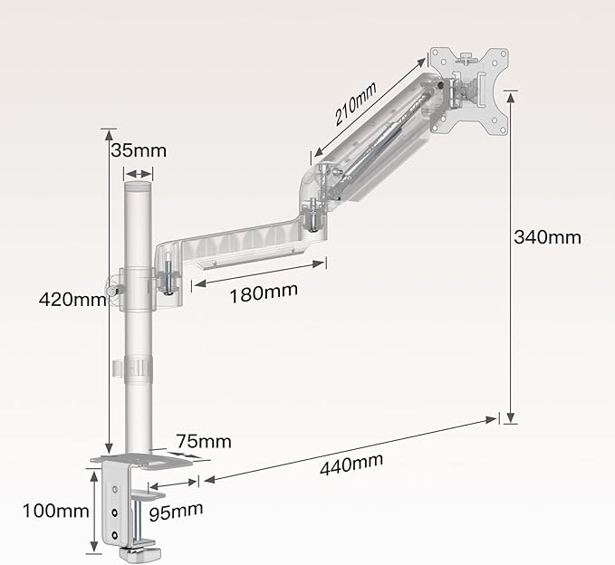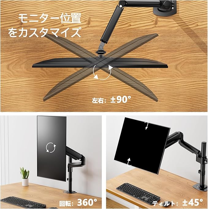 【快適にPC作業を行う】自分に合った高さや角度に変えられます。前後左右だけでなく、上下にも動かせる見やすい位置まで調節可能であるため、細かい文字や数字の確認や動画視聴などに適しています。また、モニターの位置を下げて角度を上向きにすることで、タッチパネルでの操作も便利です。※ガス圧調節方法:?モニターをアームに取り付けます?アームを水平にします?レンチでガス圧を調節します。
