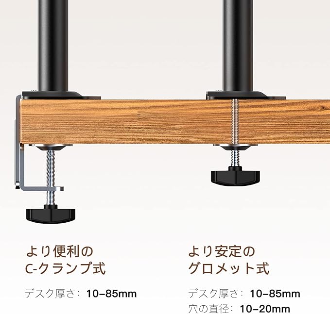 【設置超超超簡単!】モニターアームの取り付ける流れ:ベースを机に固定→本製品をモニター裏面にネジ止めする→モニターを上下(チルト)傾けれるようになる→動きが緩ければ六角ネジで調整する。クランプ式インストールとグロメット式インストールともに対応しています。