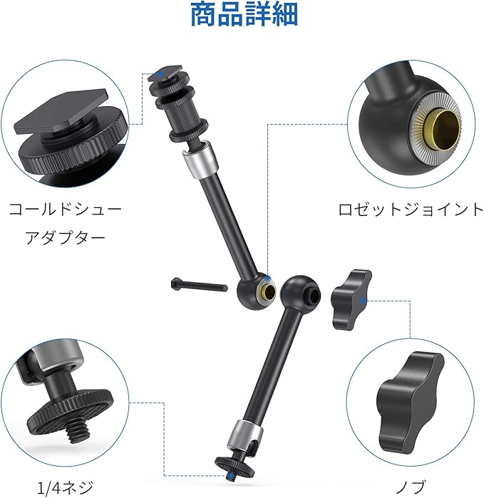 中央のノブを締め付けるだけで、全ての間接部が同時に固定されます。アーム両端は1/4インチオスネジの仕様になって、様々なカメラアクセサリを取り付け可能です。