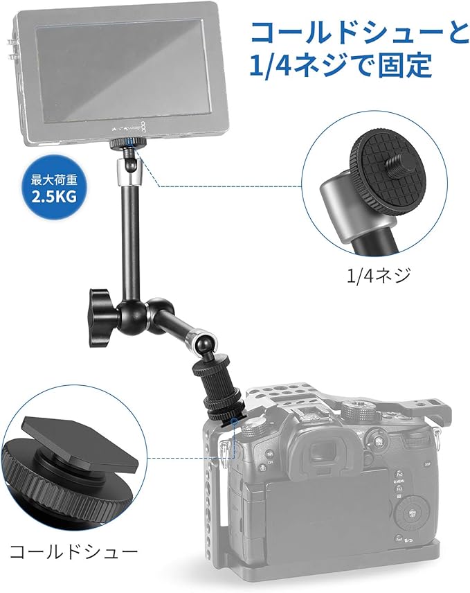 マジックアームの片端はモニターに直接取り付けることができ、反対側はコールドシューマウントを介して、ケージに取り付けることができます。