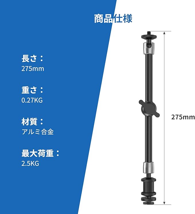 このマジックアームは、耐久性に優れた素材で、最高レベルの品質基準に沿って作られているため、驚くほど使い勝手が良いアイテムです。1/4インチネジとコールドシューマウントがありますので、小型LEDライト、外付けモニターやモノブロックストロボなどへのカメラ搭載時により軽量かつコンパクトなセットへの切り替えが簡単に行えます。