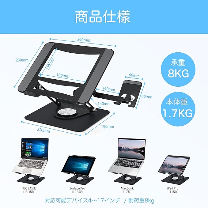 幅広い互換性:ノートpc スタンドはMacBook,iPad,Samsung, Acer, Lenovo, Sony ,HP東芝など最大17.3インチのノートパソコンが通用し、携帯スタンドは4~8インチまでのデバイスに対応できます。安心サービス:商品に何か問題があれば、ぜひお気軽にお問い合わせください
