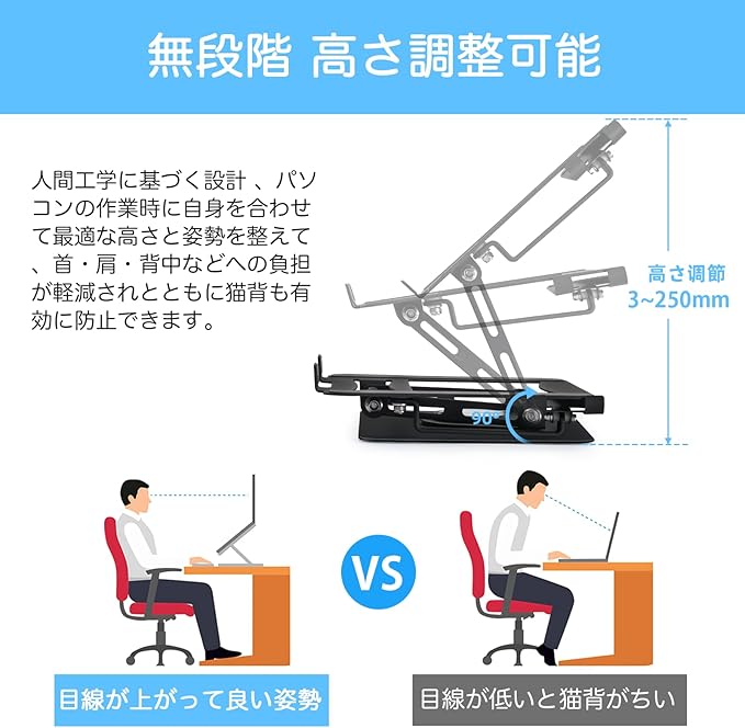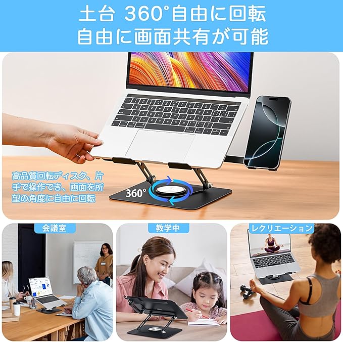 360 回転・無段階調整 :パソコンスタンドは360 自由に回転でき、片手でPCスタンドを軽く押すことで、ノートパソコンをあらゆる角度に回転させ、他人との画面共有を容易にすることができます。人間工学に適した設計で、自分の身長とデスクトップの高さに合わせて、ノートブックPCスタンドの高さを無段階に調整することができます