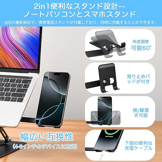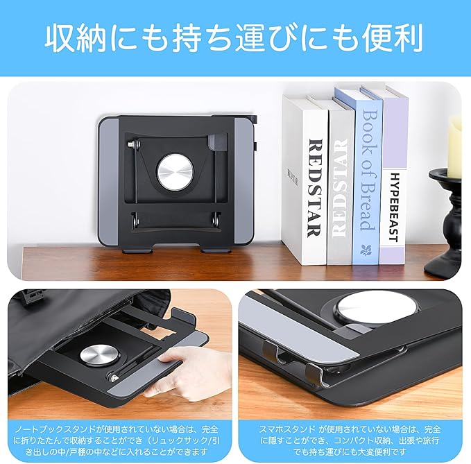 収納に便利:パソコン スタンドは折り畳み式で、携帯スタンドもすっぽり折りたたんで収納できます。収納や持ち運びにも便利です。オフィス、自宅、外出先など、さまざまなシーンで活躍します