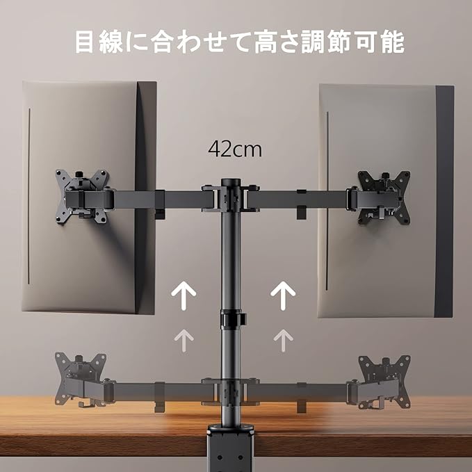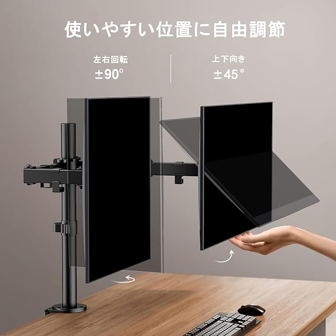 【2画面で作業スペースを拡大】片方の画面でネット検索、片方の画面で書類作成など、作業ごとにスペースを使い分けたい・操作に広い作業画面が欲しい方にデュアル型モニターアームお勧めいたします。それぞれのモニターの回転にも対応しており、片方の画面を縦画面、もう片方を横画面にするなど、幅広い環境を構築できます。
