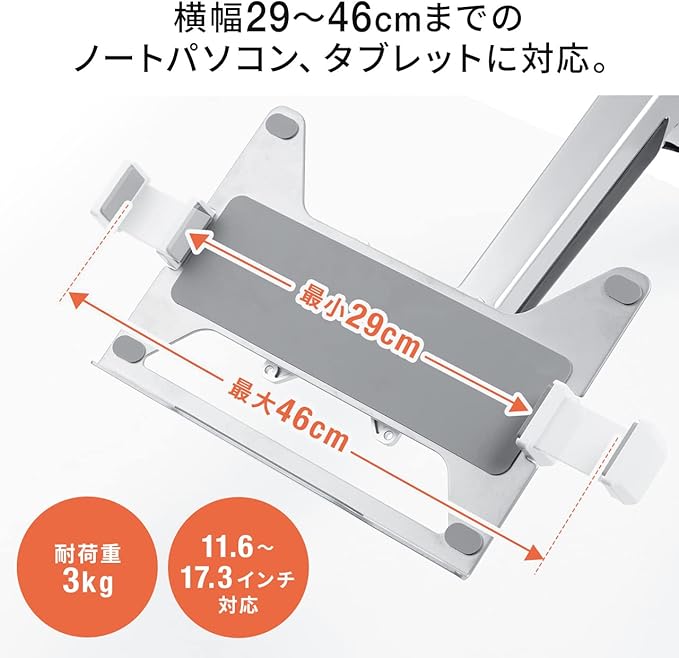 挟み込み式なのでノートパソコン、タブレットを挟み込んでお使い頂けます。(横幅29~46cm、耐荷重3kgまで)