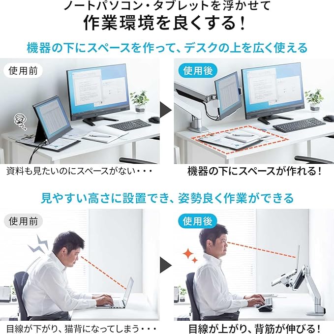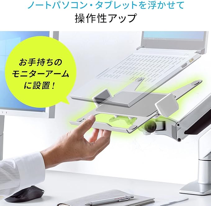モニターアームに取付けることで高さ角度の調整ができます。ノートPCをデスクから浮かせるのでデスクのスペースを有効利用できます。