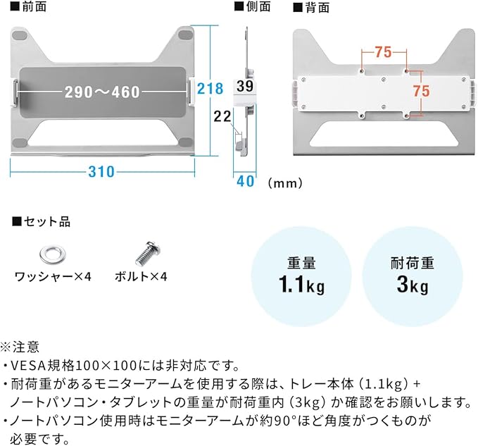 モニタアーム に取り付け、 ノートパソコン やタブレット等を設置できる ノートパソコン トレイ です。