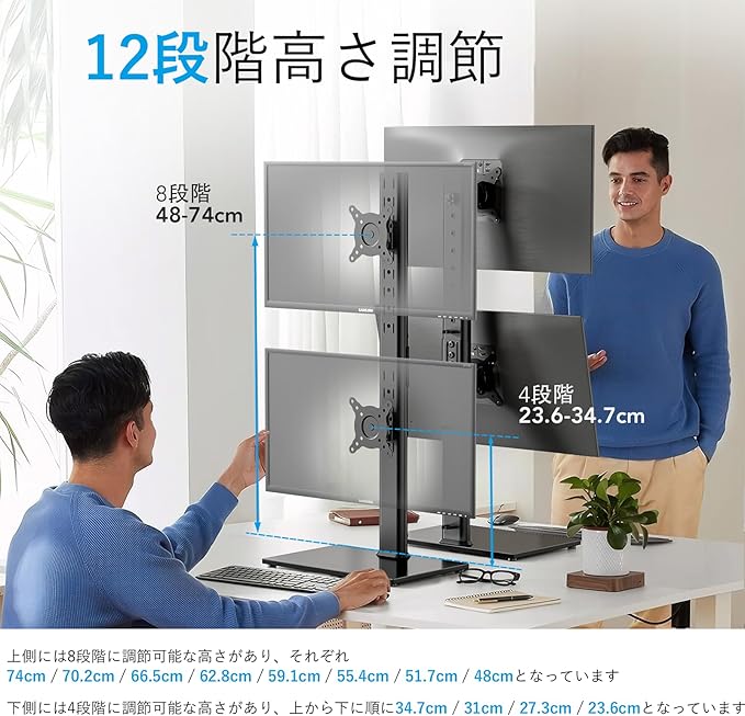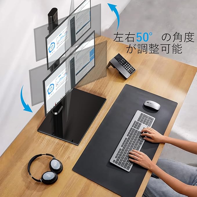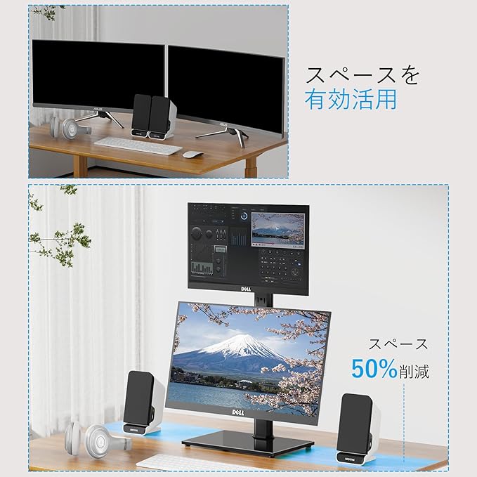 【省スペース】このスタンドは、2つの独立したスタンドを必要とせずに2台のモニターを保持することができますので、デスクトップのスペースを節約し、作業机を広々ときれいに保つことができます。