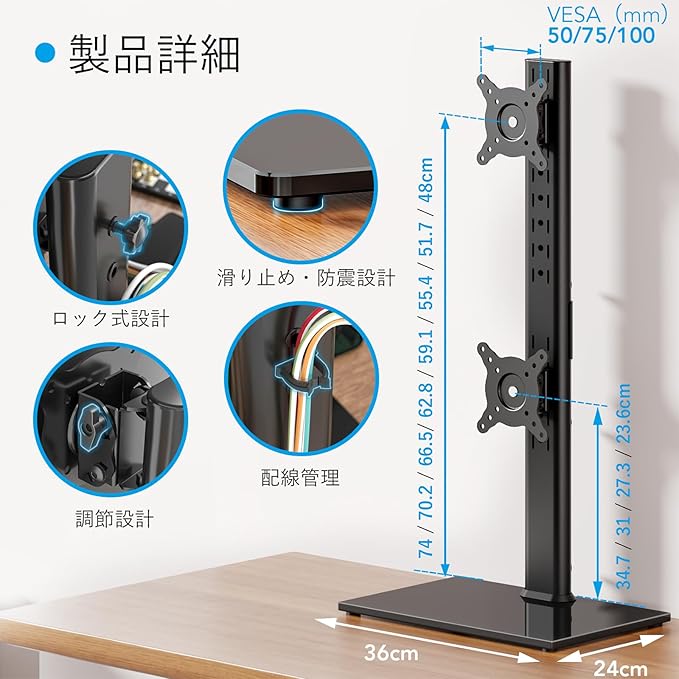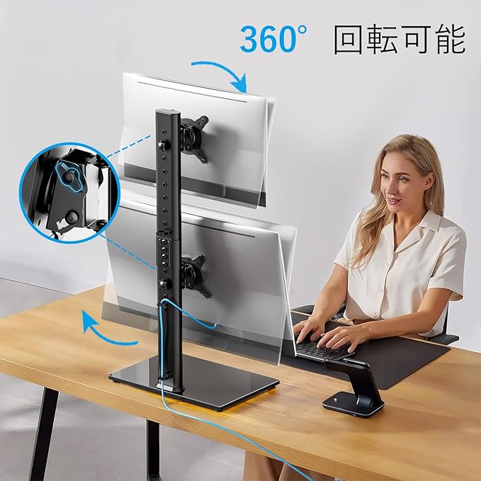 AX WABER モニターアーム デュアルディスプレイ スタンド 上下2画面 PCモニターアーム, 置き型 デュアルディスプレイ 32インチまで 縦並び 耐荷重各20kg 自立式 アーム抜き 高さ調整 VESA75x75mm/100x100mm 上下左右可動 回転可能 AX05TB02