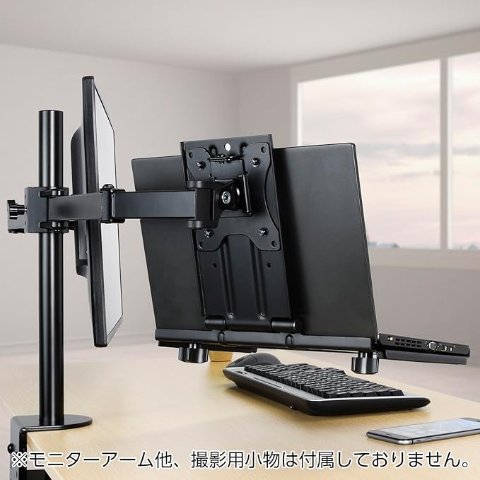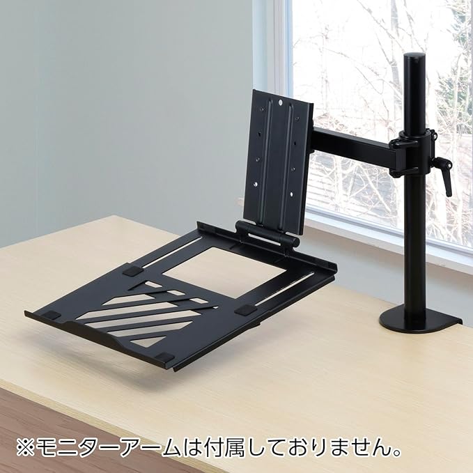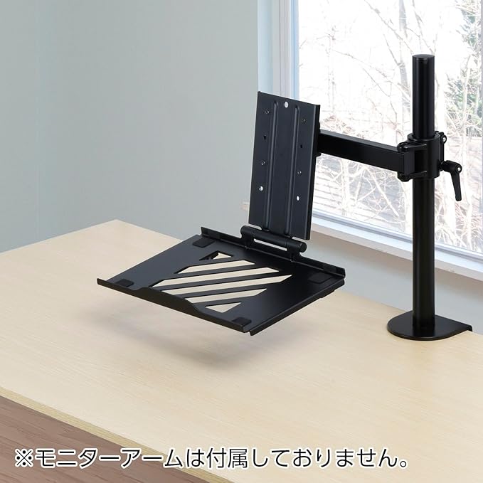 モニターアーム環境にシン・提案! デスクトップ、ノートのマルチ作業に便利なツール ■モニターアームへノートパソコンなどが設置可能になるトレイ。 ■使わない時は邪魔にならないように折り畳むことができる設計。 ■載せた機器の放熱を助けるスチール製。大型スリット穴加工で熱こもりを防ぎます。 ■使用するノートパソコンのサイズによって奥行き調節が可能。(12~17インチノートパソコンにフィット) ■VESA75対応したモニターアームであれば取り付け可能です。 ※モニターアームの耐荷重の範囲内でご使用ください。