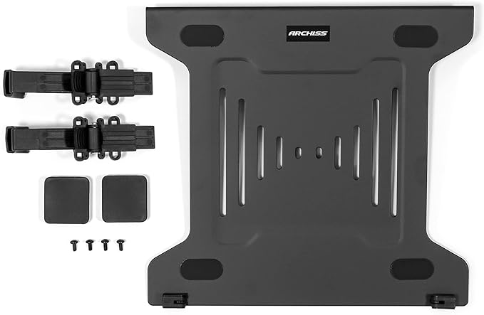 ノートパソコンをモニターアームに設置:Archissブランドのモニタアームに固定可能なノートパソコンホルダー。 ノートパソコンを見やすい位置でデュアルディスプレイとしてご使用可能です。
