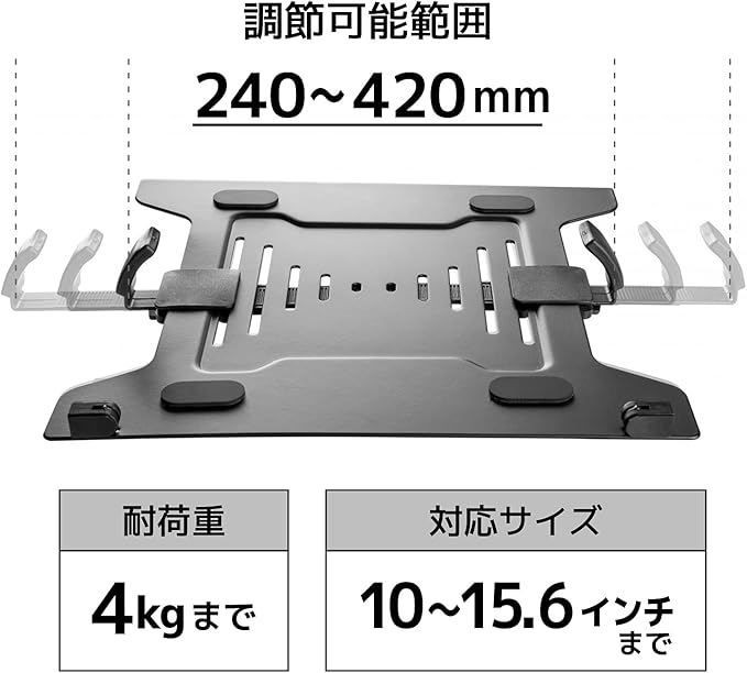 調節可能範囲:両サイドのアーム幅が240〜420mmまで調節可能。 10インチから最大15.6インチまでのノートパソコンに対応しております。