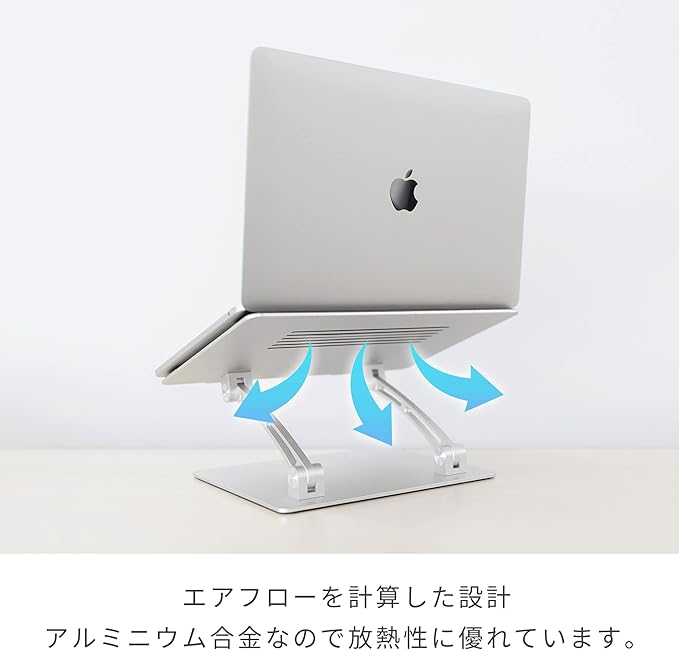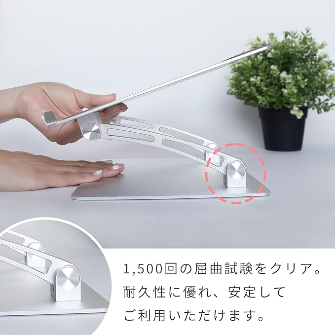 丈夫なアルミニウム合金製:アルミニウム合金素材で耐荷重20kgなので、大き目のノートパソコンや液タブを載せてもスタンドが下がってきたり、揺れたりすることはございません。。 エアフローを計算した設計なので、放熱性も抜群です。 またシリコンパッドが接地面と端末面についているので、机を傷つけたり端末が滑り落ちる心配はございません。
