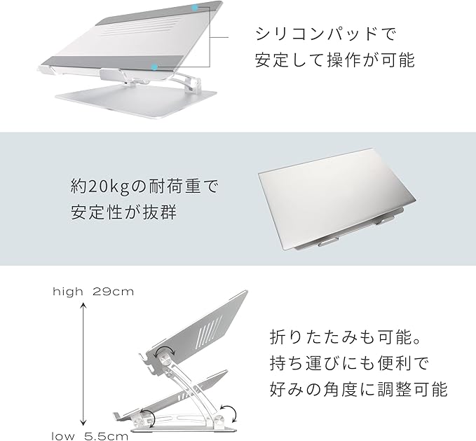 使わない時はコンパクトにたたんで収納し持運びにも便利:高さは5.5cm~29cmまで調整可能。折りたたみ時は3.5cmまで小さくなるので、持ち運びにも便利です。使用しない時はPCスタンドの下にキーボードを収納しておくことも可能です。