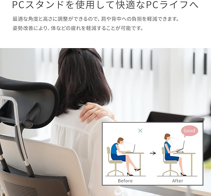 無段階で調整が出来るので、ご自身の使いやすい角度でノートパソコンを使用することが出来ます。 目線が高くなることで姿勢も改善されるので肩や背中への負担が軽減され、長時間のパソコン使用時にも安心です。