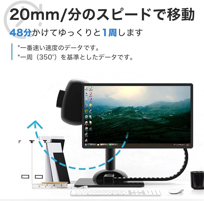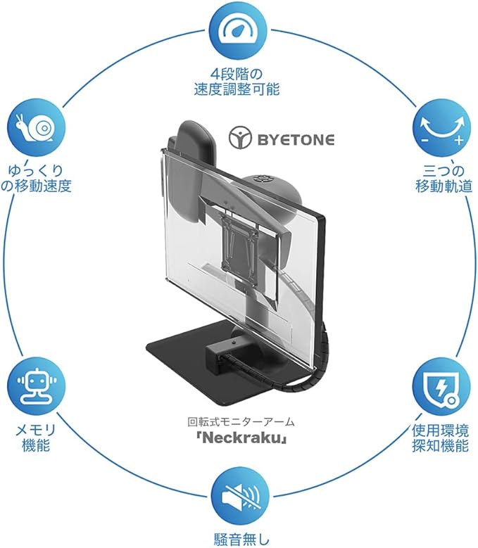 ・ゆっくりと気づかない間にモニターが回転!?首周りの辛さの軽減を追求した、新発想のモニターアーム