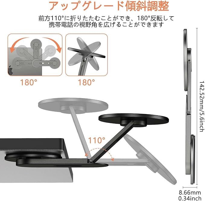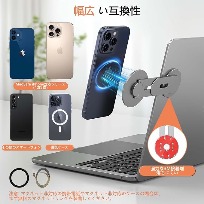 【全機種対応設計】M1/M2/M3 Mac全機種&iPhone16/15/14/13/12シリーズ(ケースなしで直接磁着)に対応。付属のナノ吸着メタルリングでiPhone12以前/Android/Padも360度強磁着可能。