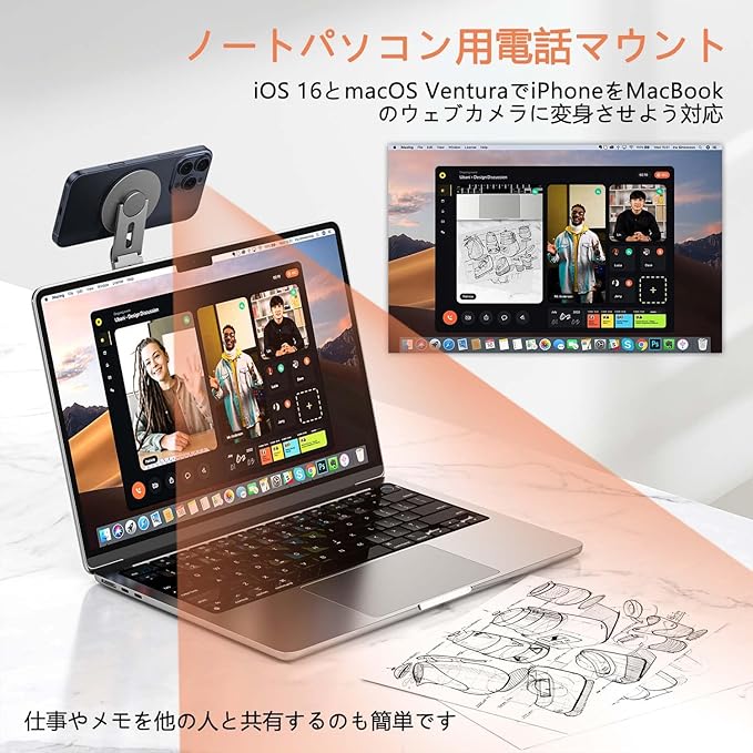 【Mac専用Continuity Camera連動】Appleエコシステムのマグネット連動技術を搭載。iPhoneをMacの高精細WEBカメラに変身させ、リアカメラ自動起動&俯瞰/水平/仰角のマルチアングル切替を実現。オンライン授業/テレカン/ライブ配信時に画質400%向上。