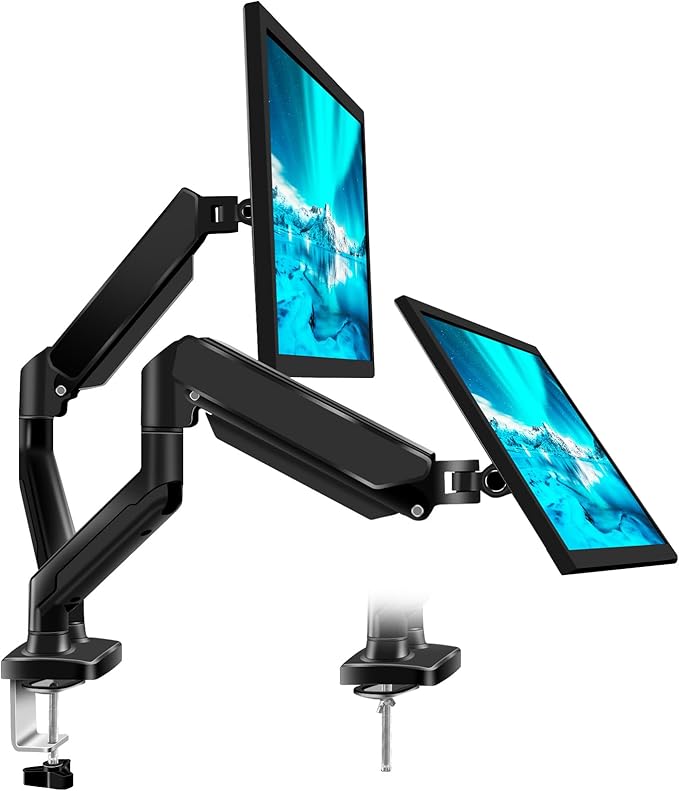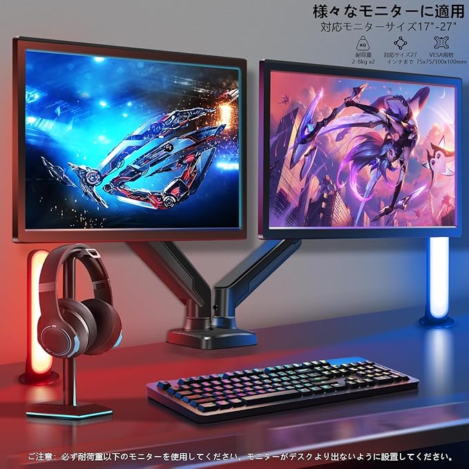 モニターアーム デュアル PCモニター アーム 2画面 17~27インチ対応 VESAスタンド シングルアーム耐荷重8kg ガススプリング内蔵 ケーブル収納 ディスプレイアーム グロメット式&クランプ式(ブラック)