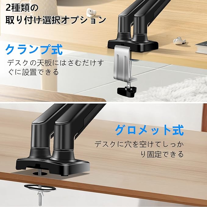 【二つの取り付け方】クランプ式とグロメット式二つの取り付け方があります。クランプ式:取り付けたいデスクの天板を上下から挟み込んで設置します。板状の天板であれば、基本的には設置可能で天板に穴をあける必要が無く、誰でも簡単に設置可能です。グロメット式:天板に穴をあけて(対応穴の直径:1-5cm)、ボルトを通して天板を挟み込むタイプです。より強力に固定することができます。ご利用の机を確認してから、取り付け方をご自由にお選びください。組立のすべて部品は付属しています、簡単に取り付けできます。