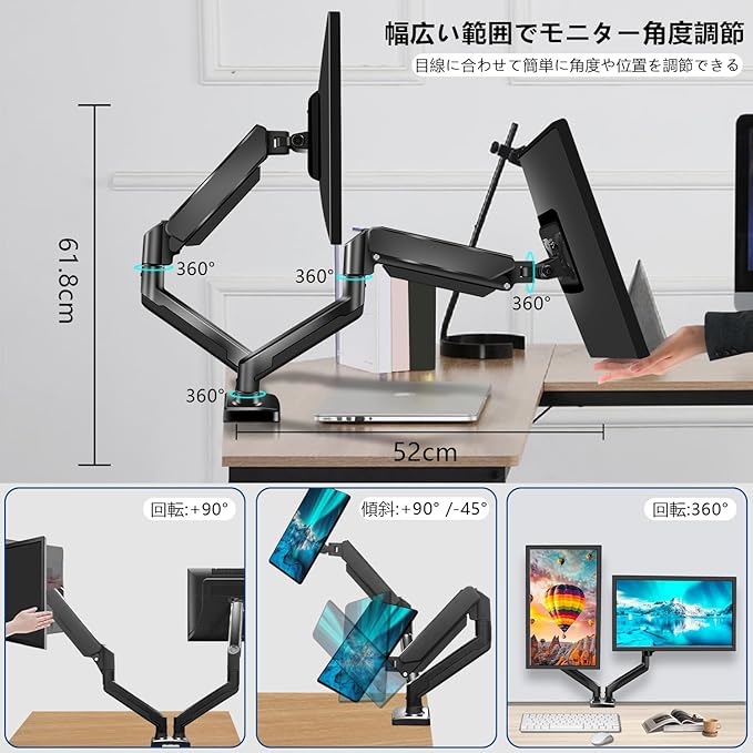 【表示角度を自由に変更可能】革新的な多軸設計により、画面を上方向に30度、下方向に85度、左右に180度、360度回転することができ、ディスプレイを垂直、水平、上下左右思いのまま、最高のロケーション。 これは可能です。 モニターの高さを目の高さに調整し、肩の力を抜いて座り姿勢を改善します。
