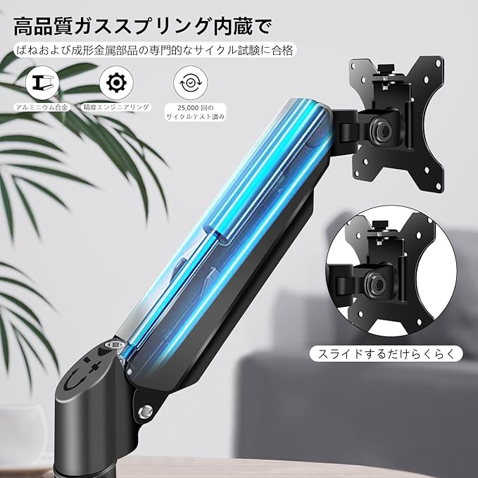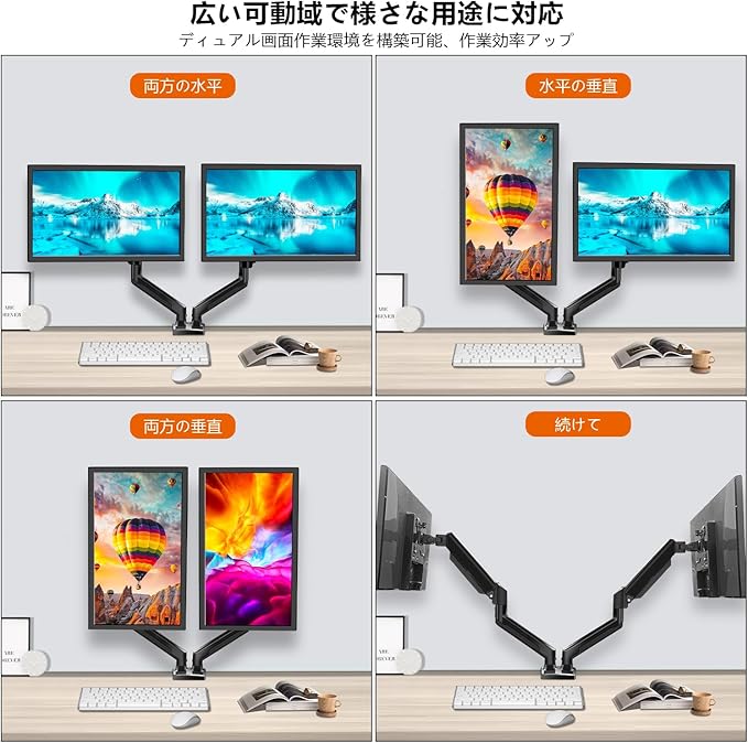 【互換【ご購入前のチェックポイント】デュアルディスプレイ(2画面)に対応したモニターアームです。重量が8kg(シングルアーム)以内の17~27インチ、VESA規格(75mm x 75mm、100mm x 100mm)に準拠したネジ穴が有する液晶ディスプレイに対応しています。性】モニターをVESAプレートに固定した後は、スライドしてアームに掛けて、ネジを締めるだけで済みます。各アームの最大耐荷重が9kgの17インチから27インチのテレビまたはモニターを2台収納できます。