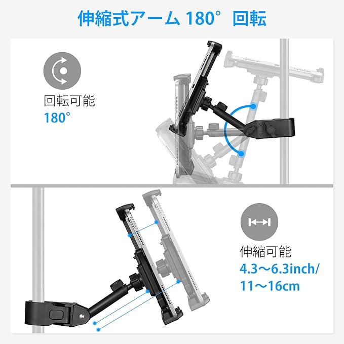 【180 まで回転可能】 スタンドアームは最大180 回転し、伸縮範囲は4.3〜6.3インチ(11〜16cm)です。ボールジョイントは最大90 の軸回転と最大360 の正面回転を提供します。使い方に合った快適な角度に調節できます。重量のある機器をクランプする場合や、垂直クランプと水平クランプを切り替える場合は、サポートアームを取り外してクランプ方向を調整し、より安定したサポートを得ることができます。具体的な方法については、画像をご確認ください。