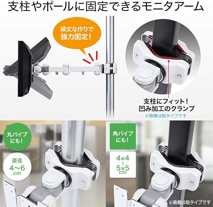 ●直径40~60mmの丸パイプや40 40~50 50mmの角パイプに取り付け可能なモニターアームです。
