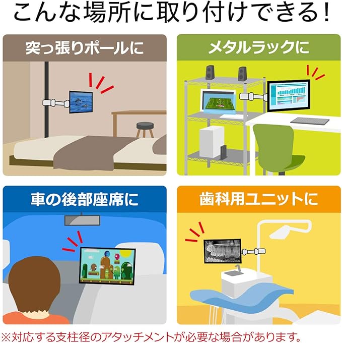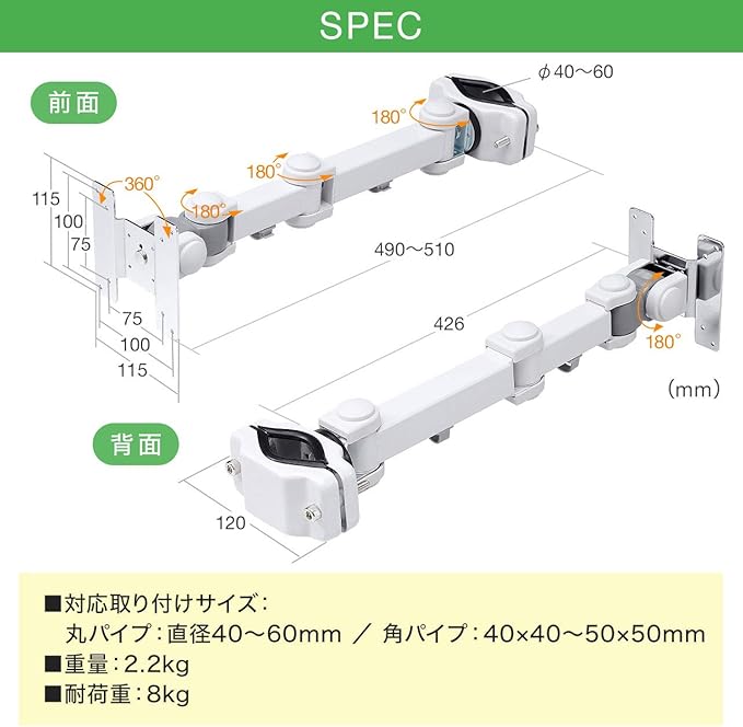 対応ポールサイズ:直径40~60mmの丸パイプや40 40~50 50mmの角パイプ VESA:75 75、100 100(mm)