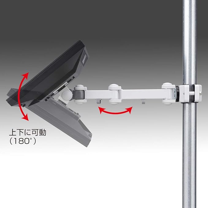 ディスプレイ取り付け部は360 回転するので、水平方向に取り付けられたパイプにも取り付け可能です。耐荷重は8kgです。