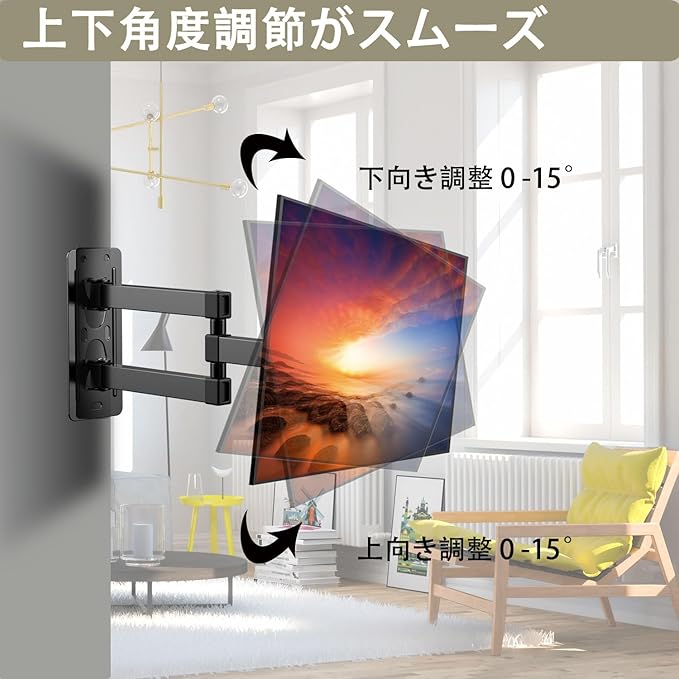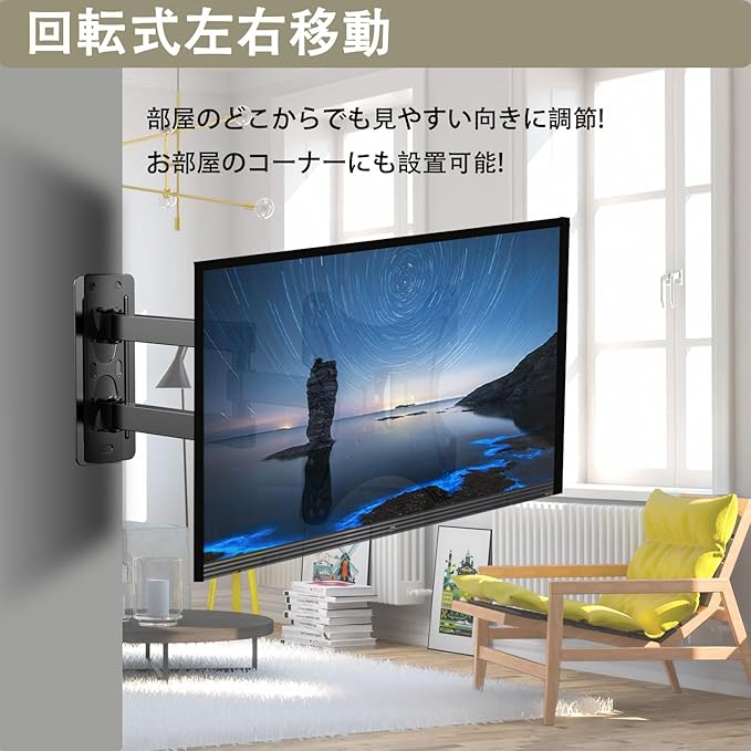 【壁掛けテレビ用金具-安全、安心】安全ロックシステムのため、角度の不安定や落下の危険などが避けられます。壁掛けのデザインで、テレビが倒れる心配がなく安心です。テレビ台が不要になり、お部屋がすっきり