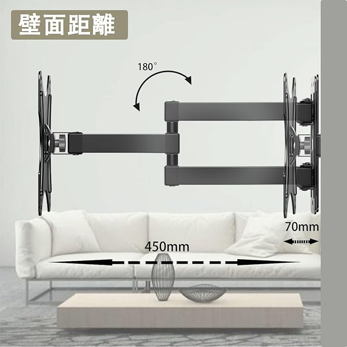【金具 壁掛け-角度調節】材質:鉄鋼の冷間圧延, 最大負荷重量:15kg(33lbs), 壁から距離:7--45cm。スペースを節約できる。调节角度上下に下向き15度,前后左右回転