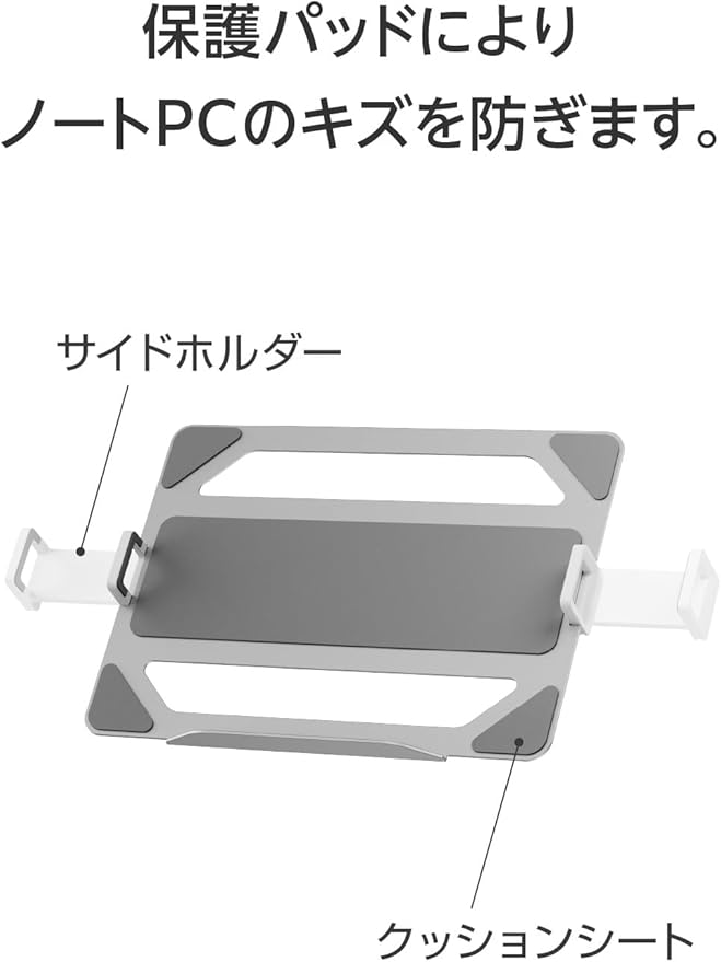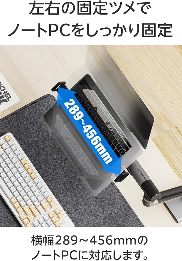●左右の固定ツメでノートPCをしっかり固定。横幅289~456mmのノートPCに対応します。