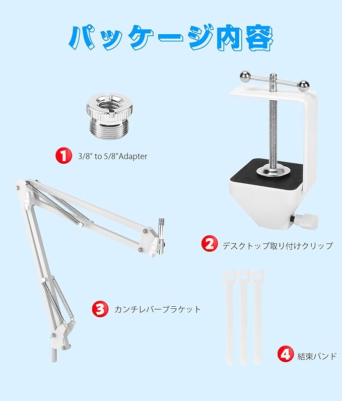[付属品] HyperX SoloCastマイクシザーアームマウント*1、頑丈なデスクトップ用マウントクリップ*1、ネジアダプター*1 (3/8 "から5/8 "まで、ほとんどのマイクとショックマウントに適合)、ケーブルストラップ*3,説明書付き。