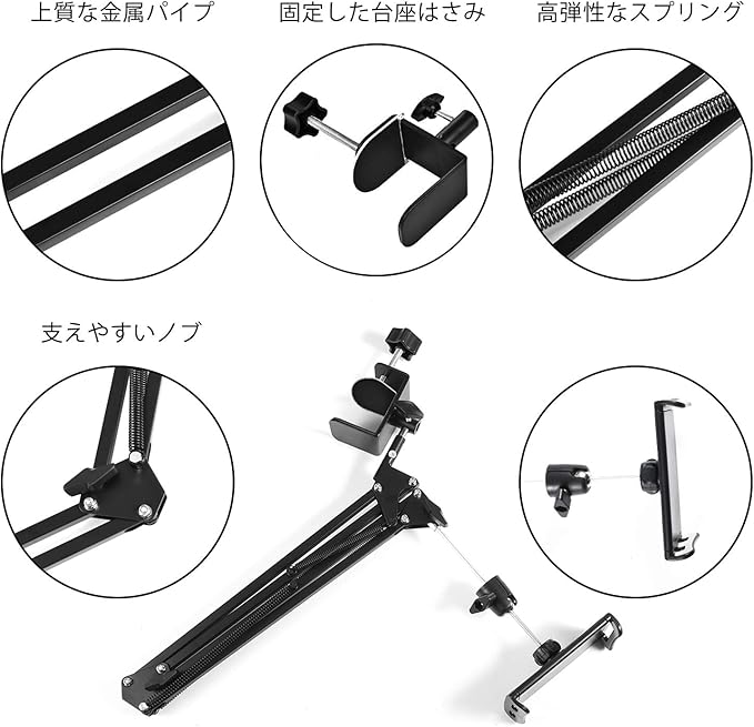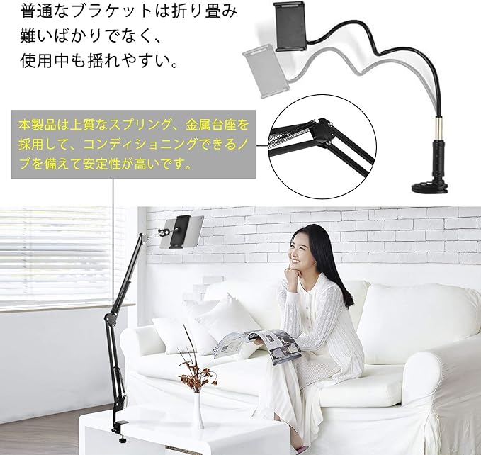 【耐荷重が強い】最大荷重:1800g: 頑丈で完全に調整可能な4段式アルミニウムアームと上質なスプリング付いたタブレットスタンドです。それに、上質なバスマットを備えたレベルアップの台座のため、使用時に安定性が高くて家具を損なわない。