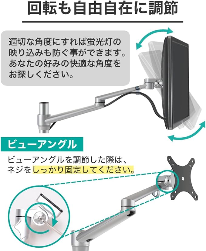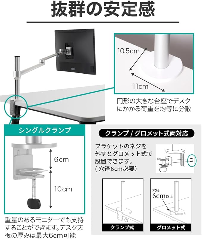 最大9kg、32インチまでのディスプレイに対応。天板厚さが60mmまでの机に設置が可能です。設置方法も分かりやすく簡単です。クランプを回して支柱を固定するだけで予期せぬ地震やアクシデントからディスプレイの転倒を防ぎます。